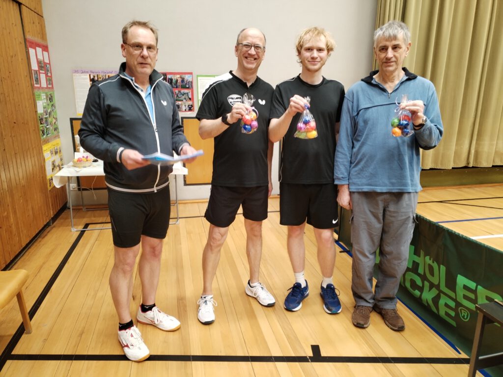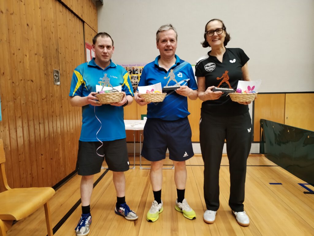 Wer Tischtennis liebt und sich auf das Osterfest freut, war am Sonntag, dem 22.03.2026, bestens bei den Tischtennisfreunden Rhenania Königshof aufgehoben. Denn dort feierte man zum vierten Mal das von Mario von der Lippe ins Leben gerufene Ostereierturnier, bei dem für jeden Teilnehmer oder Teilnehmerin nach veränderten Regeln startend der Turniererfolg möglich scheint. Der entscheidende Faktor zur Berechnung der Ausgangssituation sind die bestehenden TTR-Punkte. Wer mehr als sein Gegner oder seine Gegnerin davon besitzt, startet mit dem Handicap in das Duell, schon mit einigen Punkten in einem einzigen zu spielenden Satz bis zu 31 Punkten zurückzuliegen. So begann man um 14.30 Uhr mit der Gruppenphase, danach folgten die KO-Phase und die Trostrunde. Die spannendsten Spiele konnte man am Ende bei den Halbfinals und den Finals verfolgen. Das Finale gipfelte demnach in 2 Endspielen, bei dem sich der erfolgreichste Teilnehmer aus der Trostrunde mit zwei Siegen beweisen musste. Das gelang Stefan Kunze gegen den späteren Sieger Jürgen Plehn nicht. Er konnte einmal auftrumpfen und erreichte immerhin noch den zweiten Platz. Über den dritten Platz konnte sich Christa Weiler freuen. Platz vier erspielte sich Jörn Wilcken, während sich Hans Heyligers und Lennard Schlage den fünften Platz teilten.